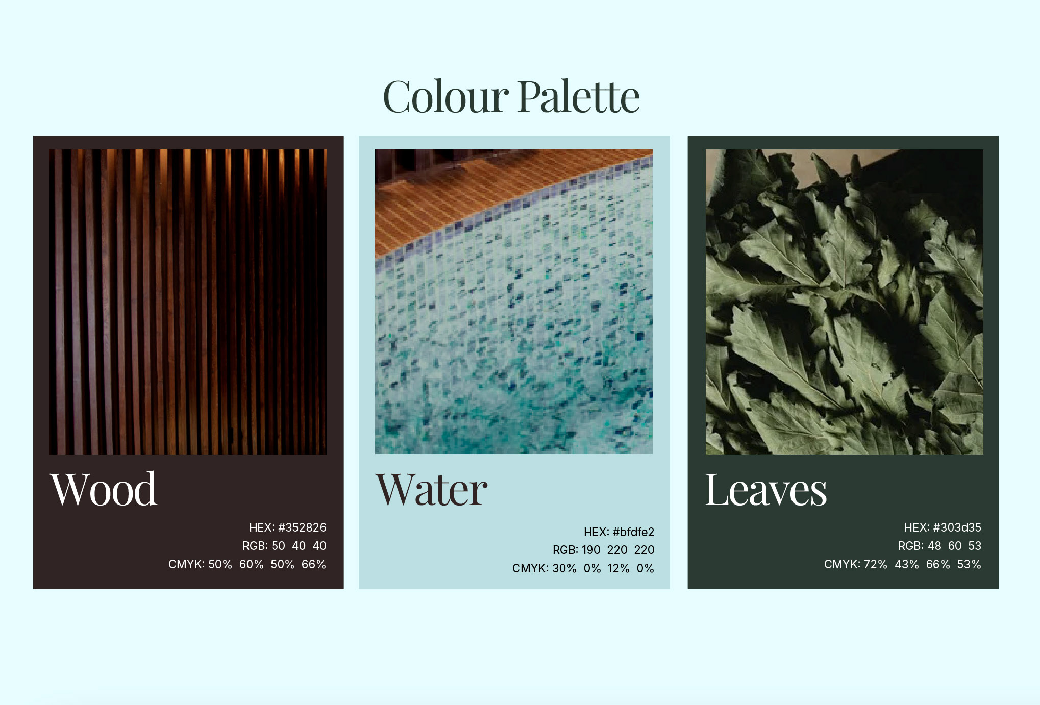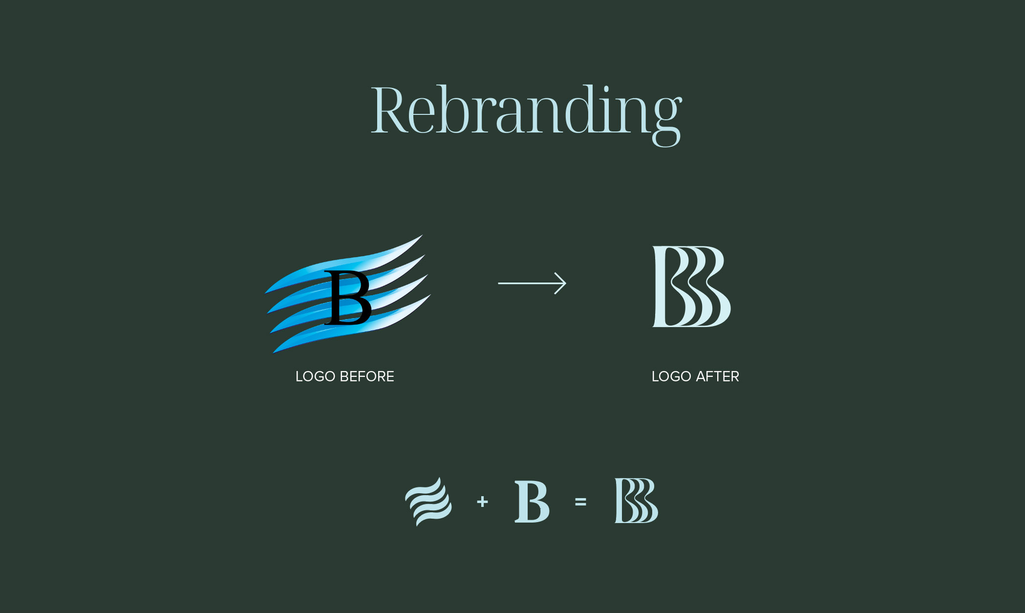 The new symbol is the letter B, shaped as a combination of wave and steam, capturing both the purity of water and the warmth of the sauna. The color palette — brown, green, and blue — represents wood, nature, and water, grounding the brand in its authentic elements. The result is a clean, balanced identity that feels contemporary but still honours the spa’s heritage.